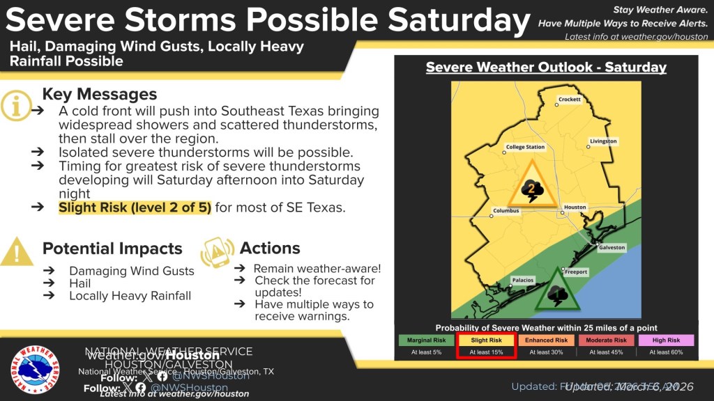 We are now within range of most of the high-resolution models. These models show the storms moving into the Houston Metro area later in the day (versus midday). I think this is the right trend and most of us will stay dry most of Saturday. So, not a washout tomorrow. By late afternoon, a squall line will form and move through during the evening hours. Some of the storms could be severe, especially as the first storms pop-up. Any isolated cells could become tornadic. As the storms mature into a squall line, the main threat will transition into straight-line winds.