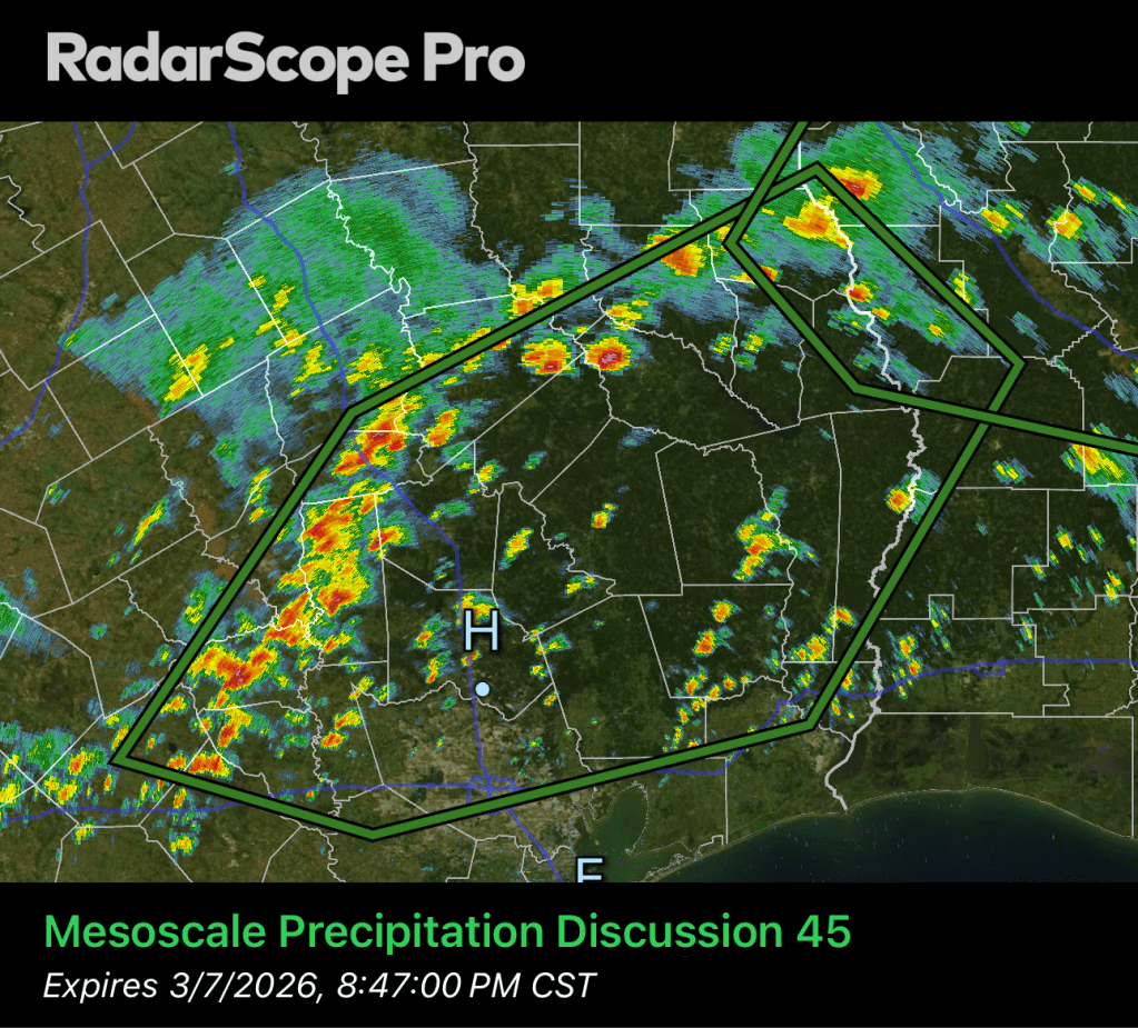 The Houston area has been place in what’s called a “mesoscale precipitation discussion” which is essentially an area of specific focus for severe weather, in this case, heavy rainfall and isolated flash flooding.
