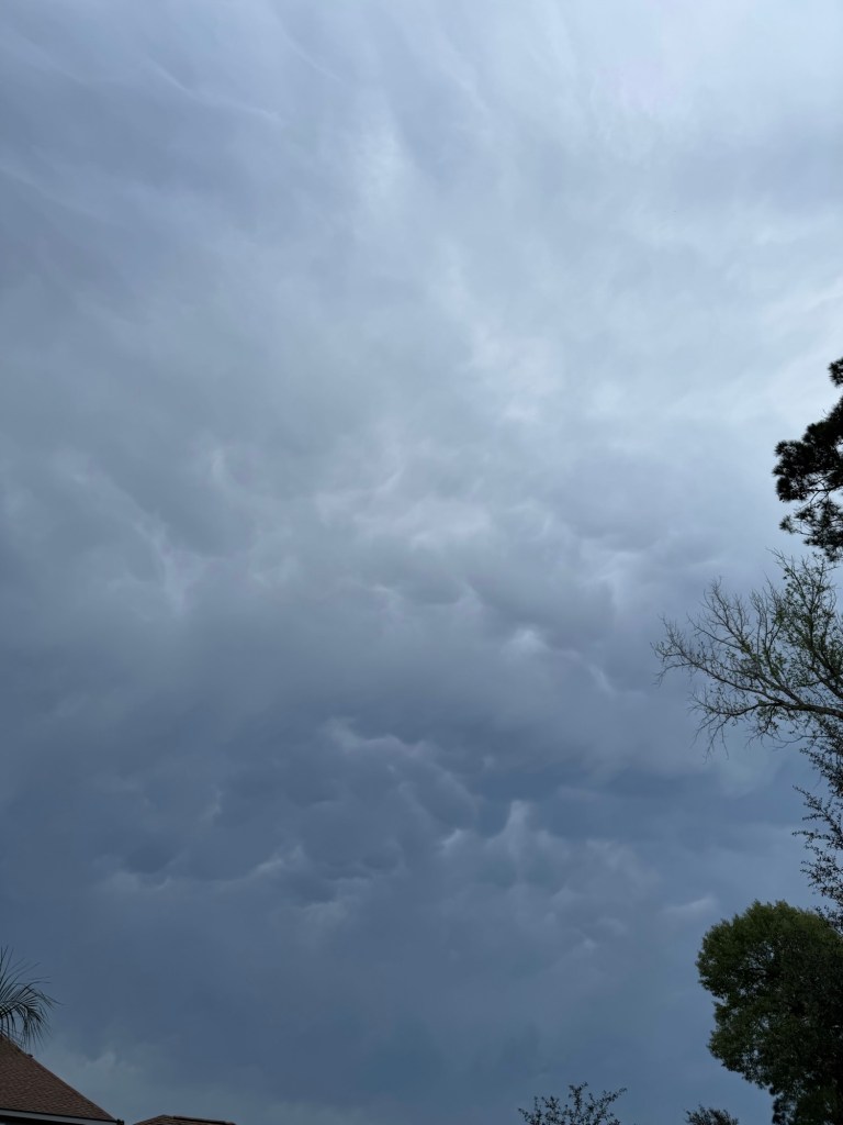 North of the house, we have Mammatus clouds forming. They look like bubbles of clouds dropping down. They are indicative of severe weather.